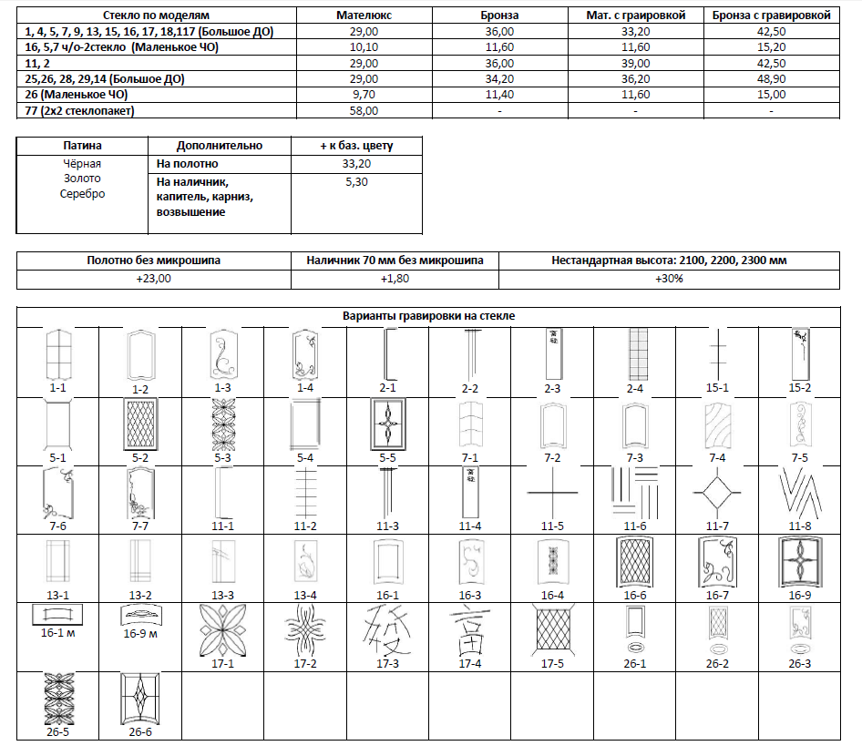 В таблице ниже поможет просчитать стоимость будущей двери с учётом стекла и учесть наличие патины.